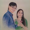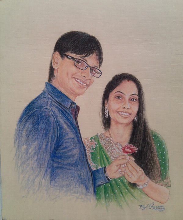 This portrait celebrates the fun-loving bond and adorable chemistry of a happy couple. Each brushstroke is filled with life, aiming to capture the shared laughter and easy smiles that define their connection. It’s a vibrant piece of art that immortalizes a moment of pure, lighthearted happiness.