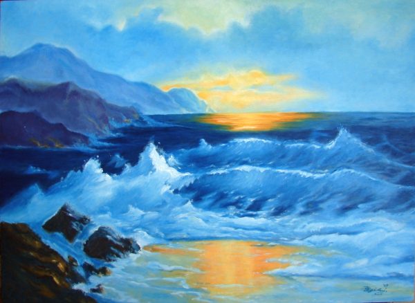 I recently completed a captivating painting titled “Crashing Sea Waves at Sunset,” a dynamic blend of landscape and still life artistry. This piece captures the raw power and majestic beauty of waves as they collide against the fading light of a setting sun. My aim was to convey the dramatic energy of the ocean alongside the serene warmth of twilight, creating an immersive and evocative seascape.