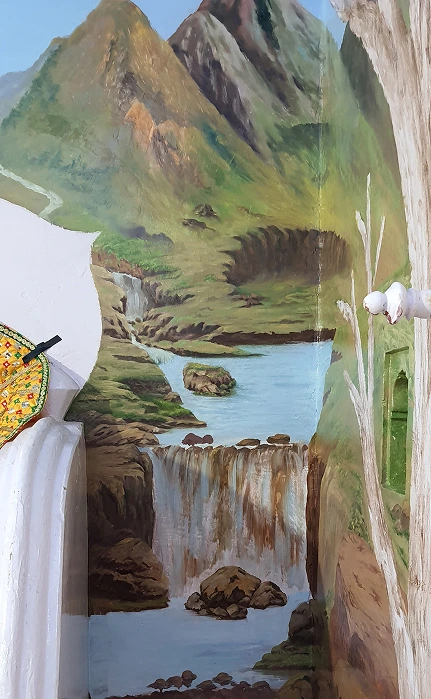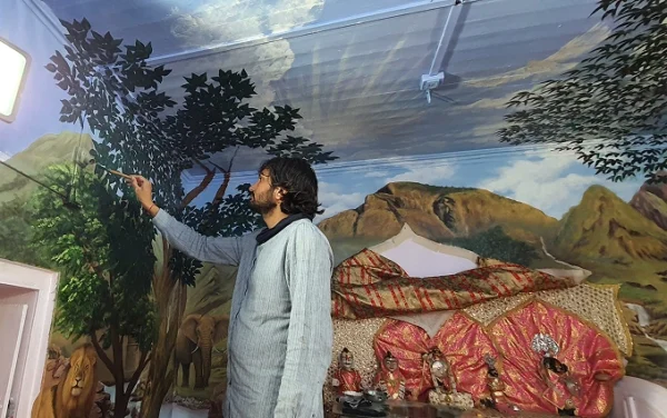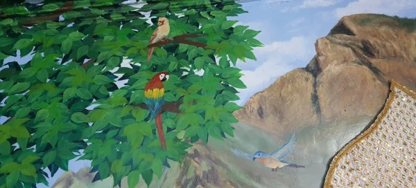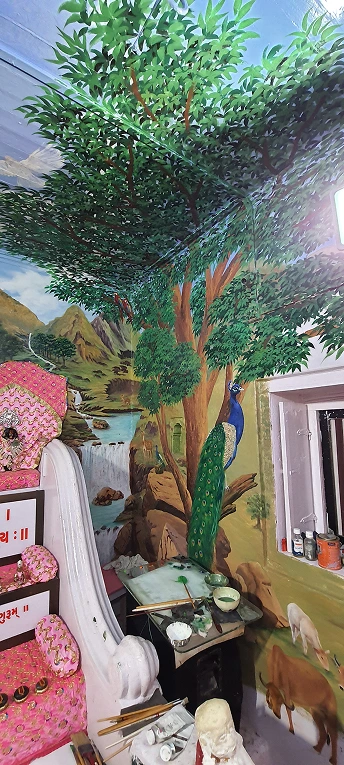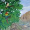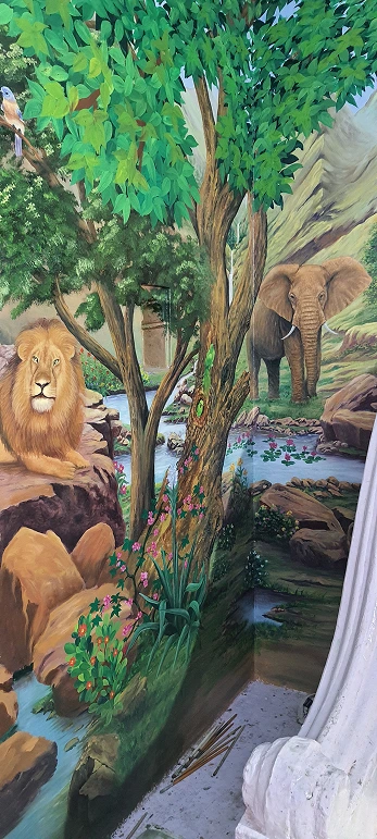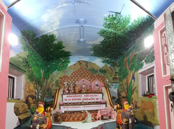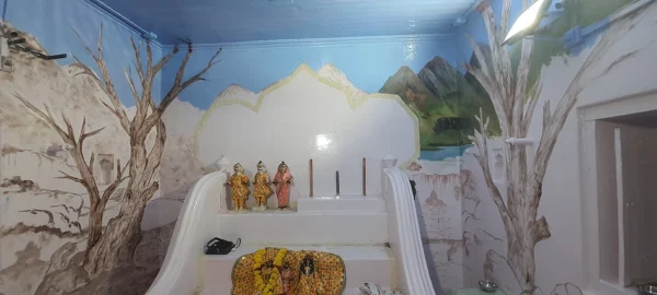 This painting beautifully blends sacred presence with natural splendor, placing deities at the heart of a serene landscape. Surrounded by lush trees, majestic mountains, and gentle animals, the scene evokes a sense of divine balance and universal peace. It is a tribute to the unity of nature and spirituality.