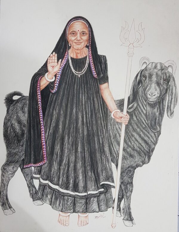 This detailed pencil sketch honors Meldi Mata, the fierce yet nurturing guardian deity revered for her protection and strength. Each stroke brings out her divine presence, reflecting both power and maternal care. The monochrome style adds depth and reverence to her timeless aura.