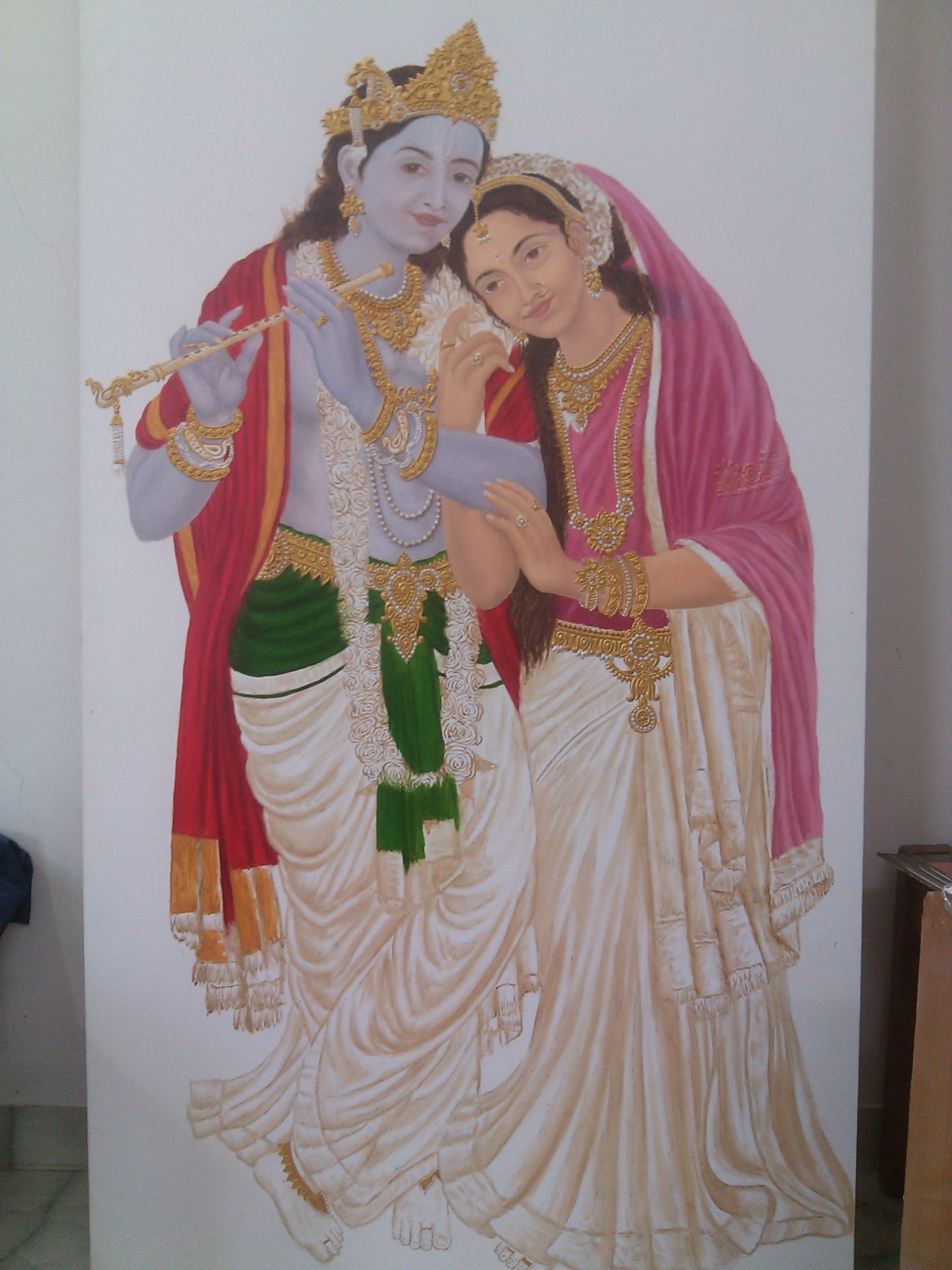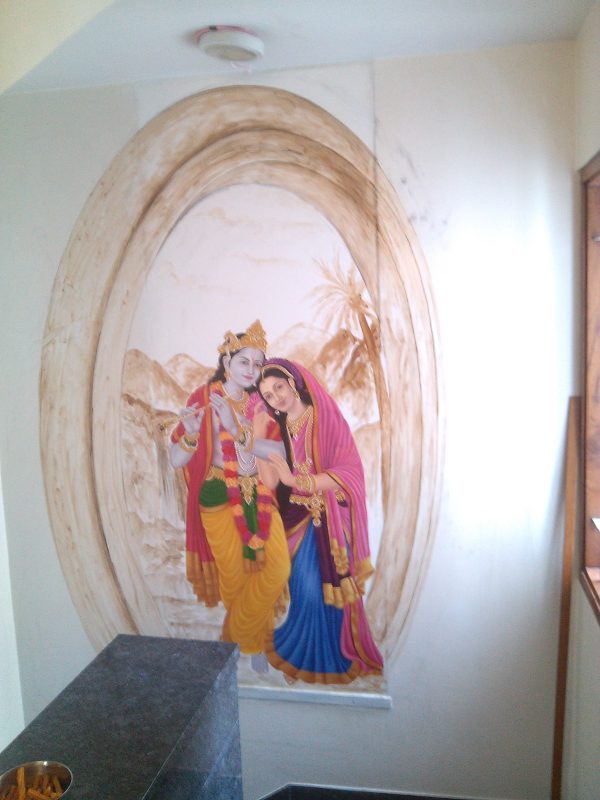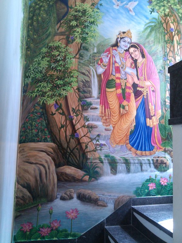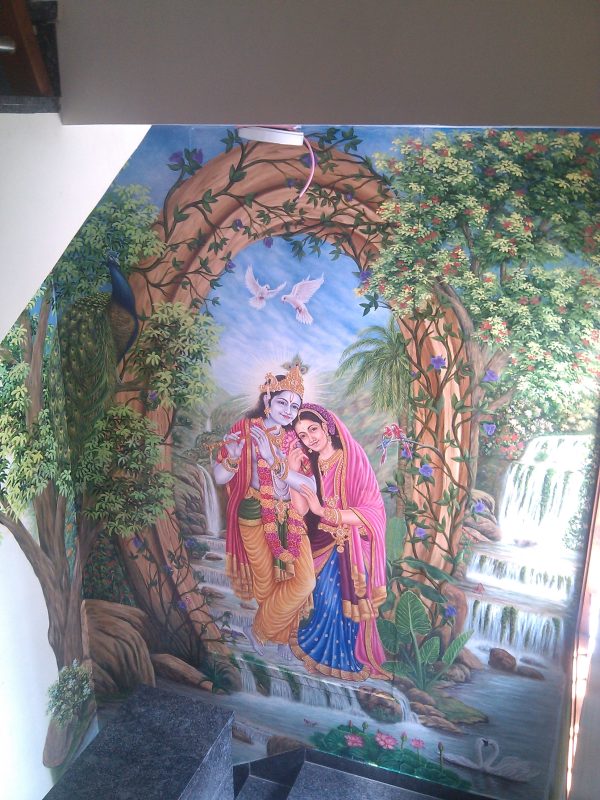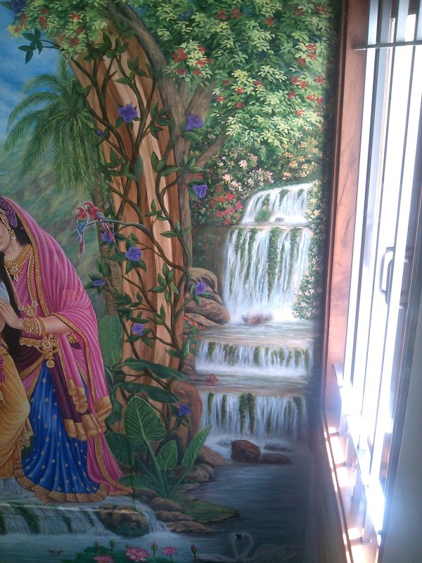 I’ve poured my heart into creating a radiant fresco depicting the eternal love of Radhe Krishna. This large-scale mural captures their divine essence, the tender emotions, and the vibrant celestial settings often associated with their stories. Each brushstroke aims to convey devotion and beauty, bringing a profound spiritual presence to the space.
