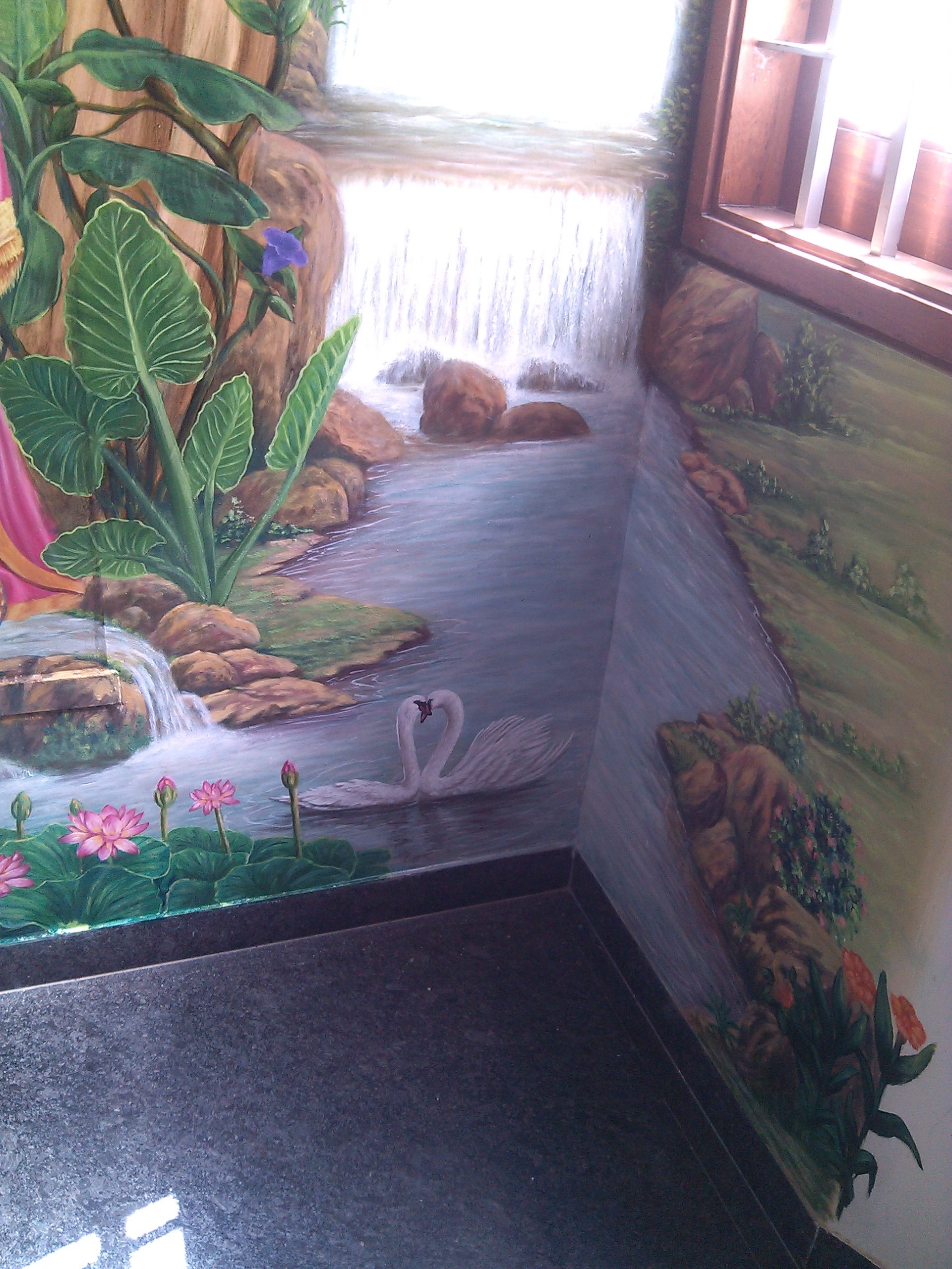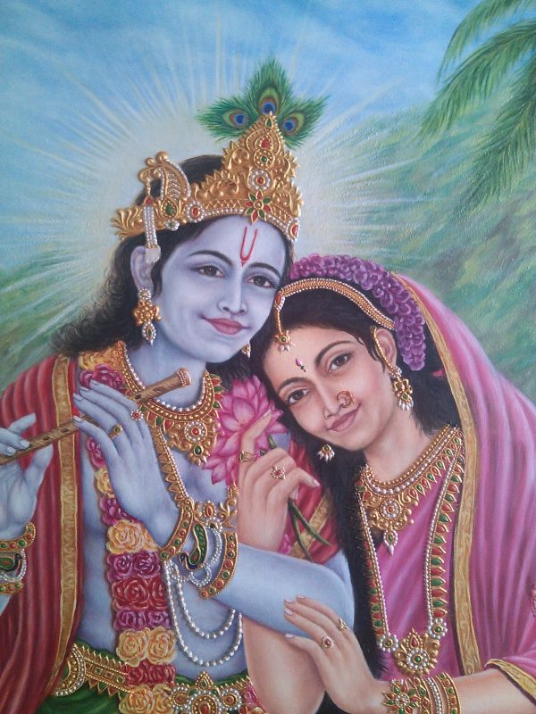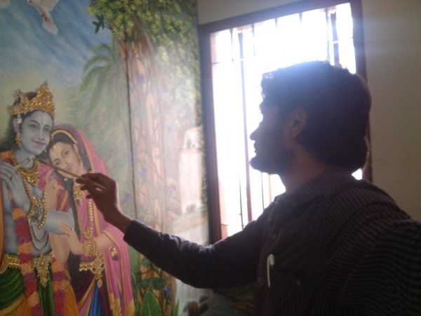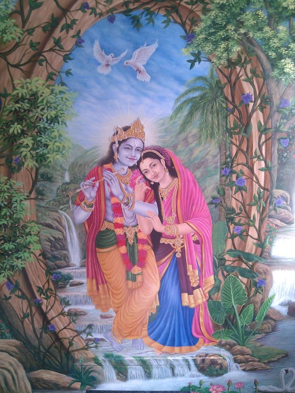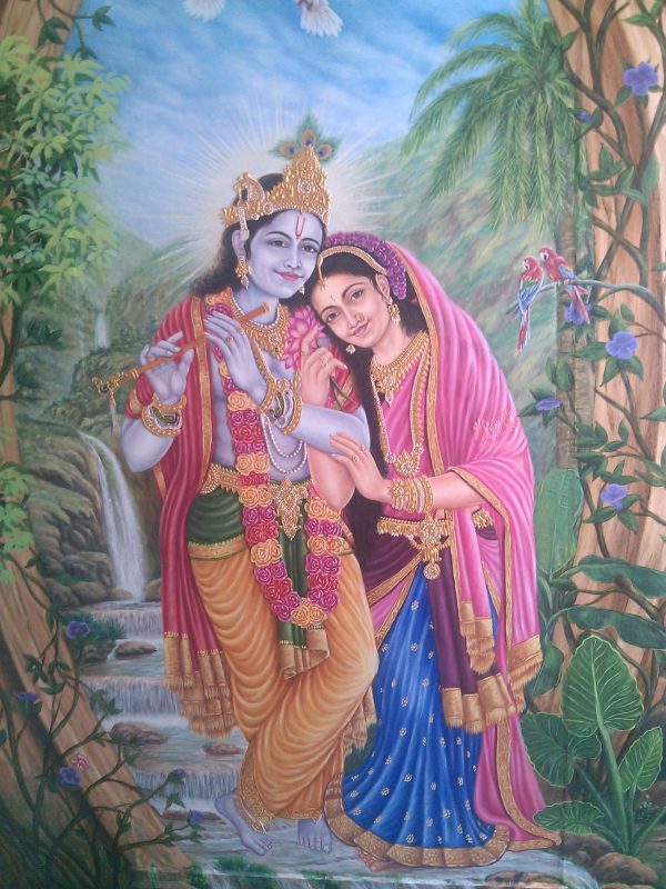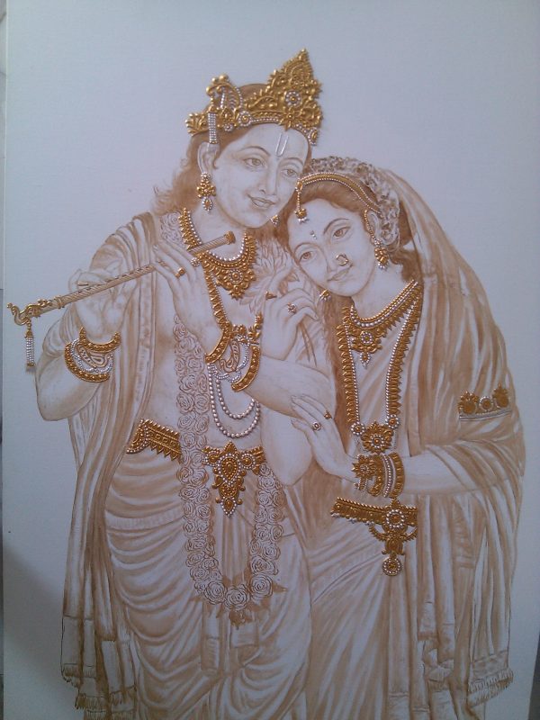 I’ve poured my heart into creating a radiant fresco depicting the eternal love of Radhe Krishna. This large-scale mural captures their divine essence, the tender emotions, and the vibrant celestial settings often associated with their stories. Each brushstroke aims to convey devotion and beauty, bringing a profound spiritual presence to the space.