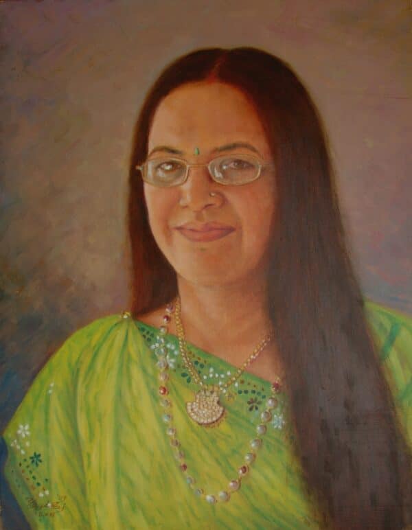 This elegant portrait captures a woman’s warmth and quiet confidence, her graceful smile framed by traditional attire and delicate jewelry. The rich green saree and detailed ornamentation highlight cultural pride and timeless beauty. A refined tribute to strength, poise, and inner radiance.