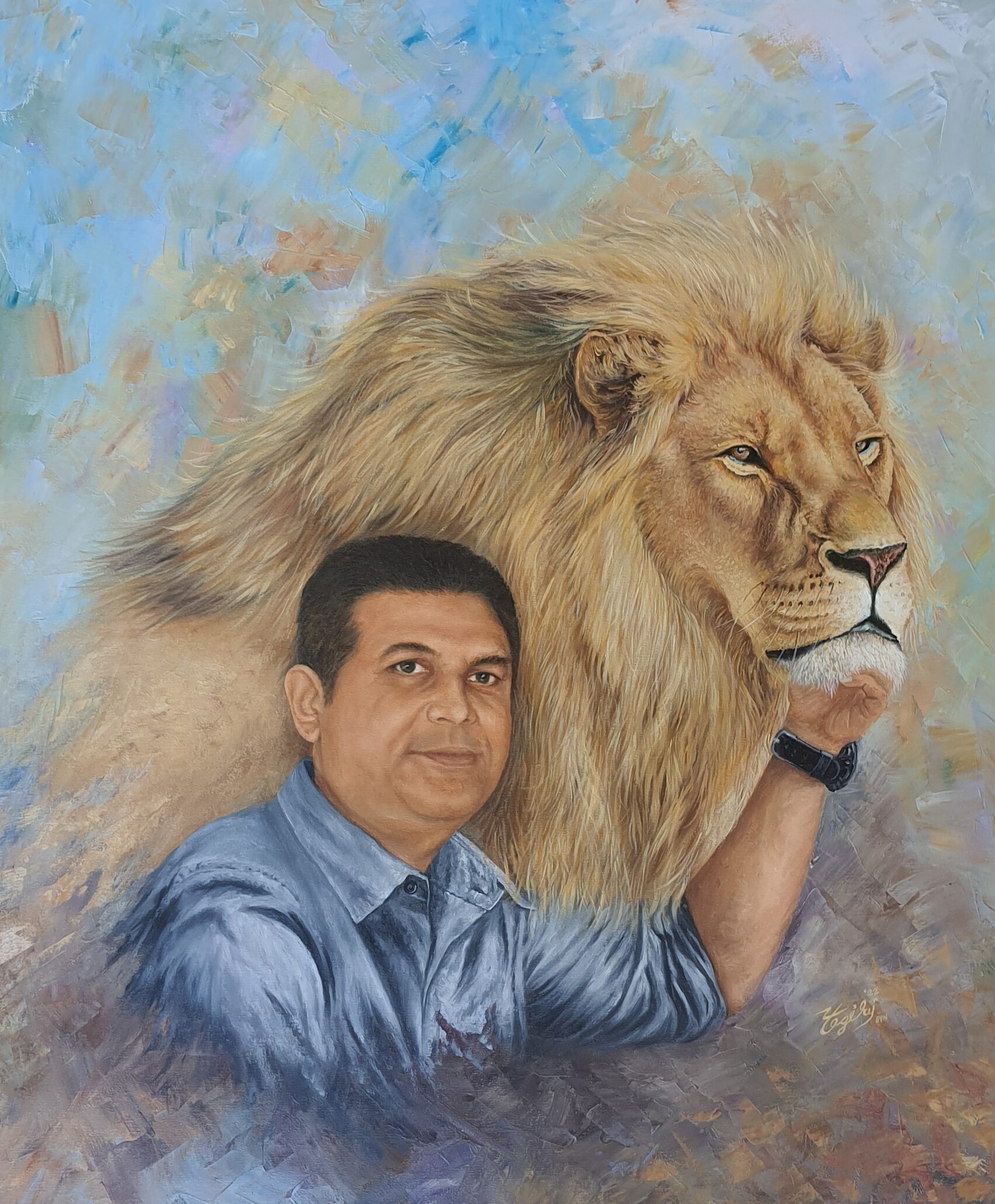 This powerful portrait symbolizes the deep connection between human courage and the raw strength of the lion. The man’s calm confidence paired with the lion’s fierce gaze reflects inner resilience and fearless spirit. Together, they embody a majestic harmony of power, wisdom, and pride.